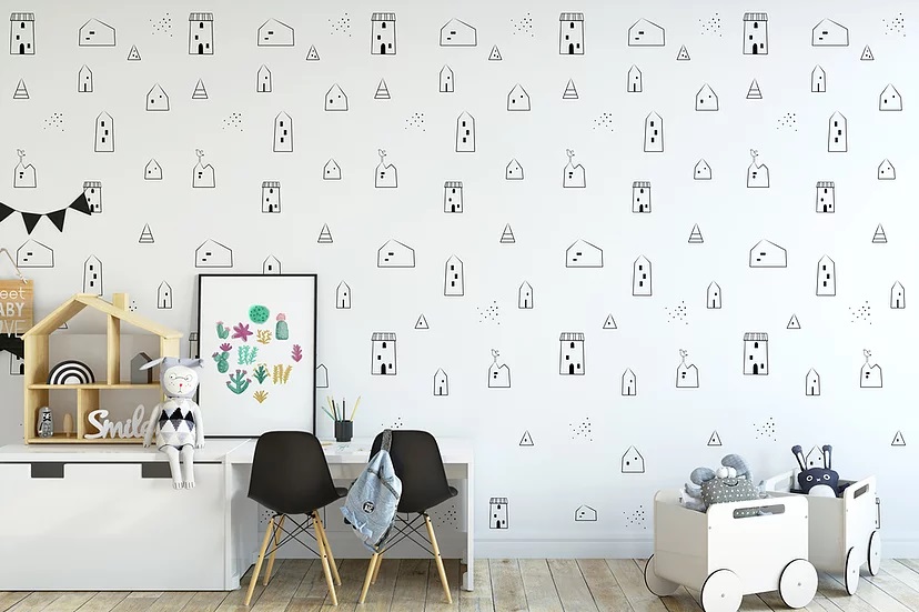 טפט מעוצב לחדר ילדים עם דבק במידה 65/300 ס"מ - בתים שחור/לבן Marvadim