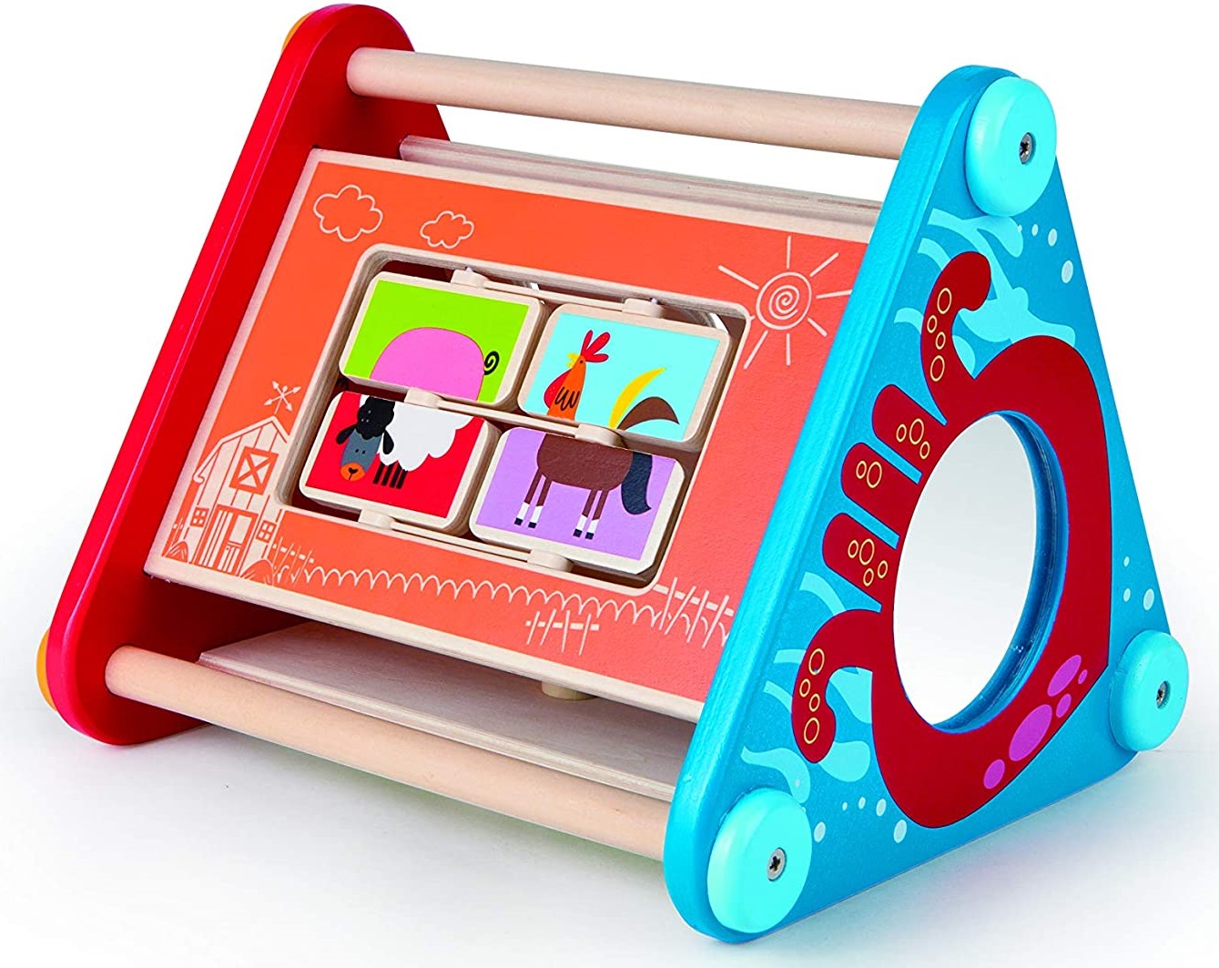 התיבה בנויה כמשולש ומציעה 6 פעילויות שונות לפעוטות כגון פאזל מסתובב, גלגלי שיניים מראה ועוד.