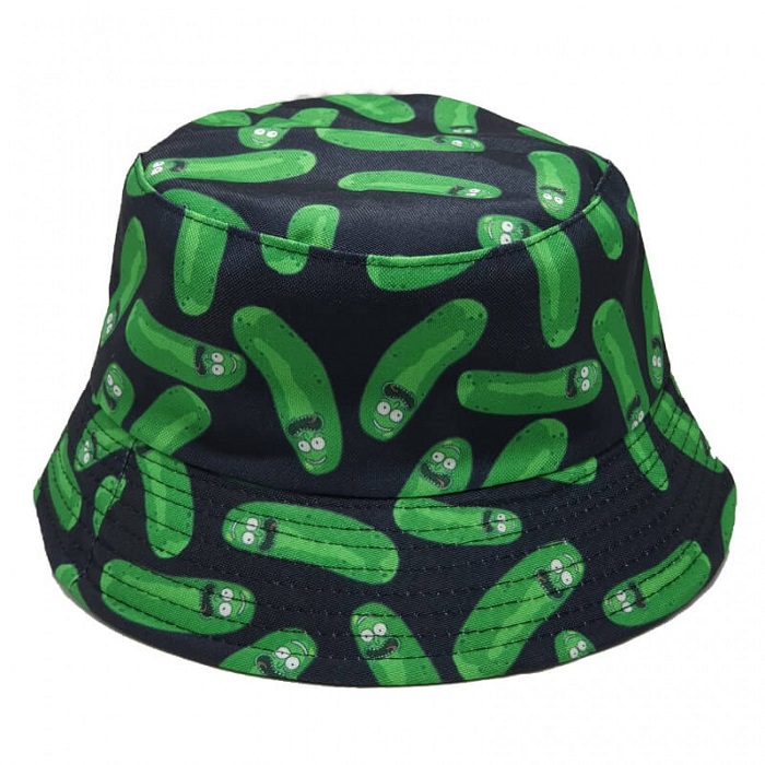 כובע טמבל בעיצוב מגניב, צבעוני ומקורי בצבע שחור עם הדפסי מלפפונים מחייכים מהסדרה “ריק ומורטי”.