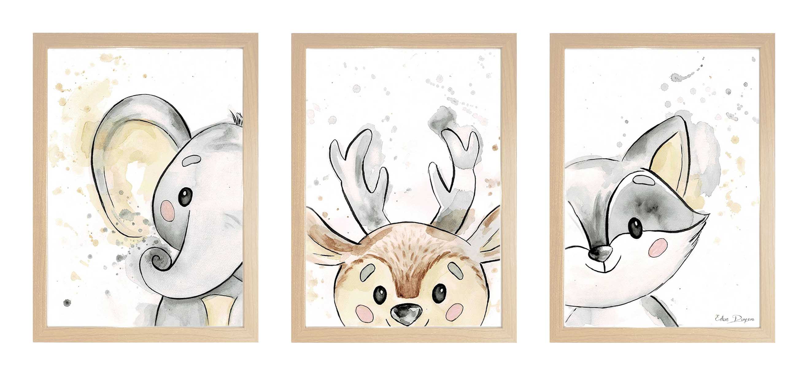 שלישיית תמונות מעוצבות לחדר תינוק / ילדים בגודל A4, מסגרת טבעי - חיות היער Eden Dayan