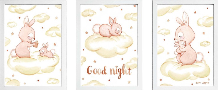 שלישיית תמונות מעוצבות לחדר תינוק / ילדים בגודל A4, מסגרת לבנה - "שעת סיפור לארנב" Eden Dayan