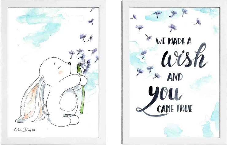 זוג תמונות מעוצבות לחדר תינוק / ילדים בגודל A4, מסגרת לבנה - ארנב מבקש משאלה Eden Dayan