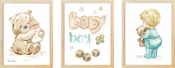 שלישיית תמונות מעוצבות לחדר תינוק / ילדים בגודל 30/40 ס"מ , מסגרת עץ - Baby boy Eden Dayan
