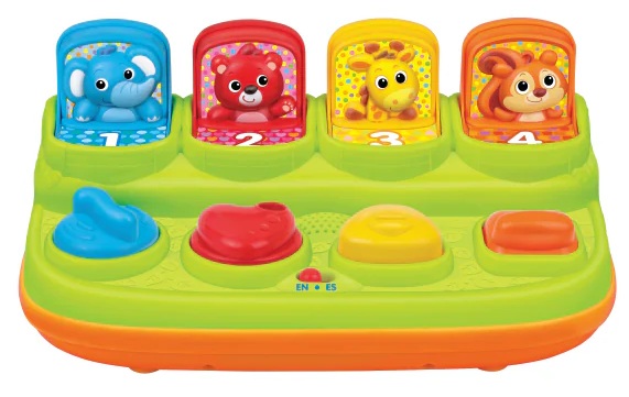 פעילות “הפתעה קופצת”:הצעצוע כולל ארבע דמויות חיות חמודות (פיל, דוב, ג’ירפה וסנאי) המסתתרות בתוך תאים.