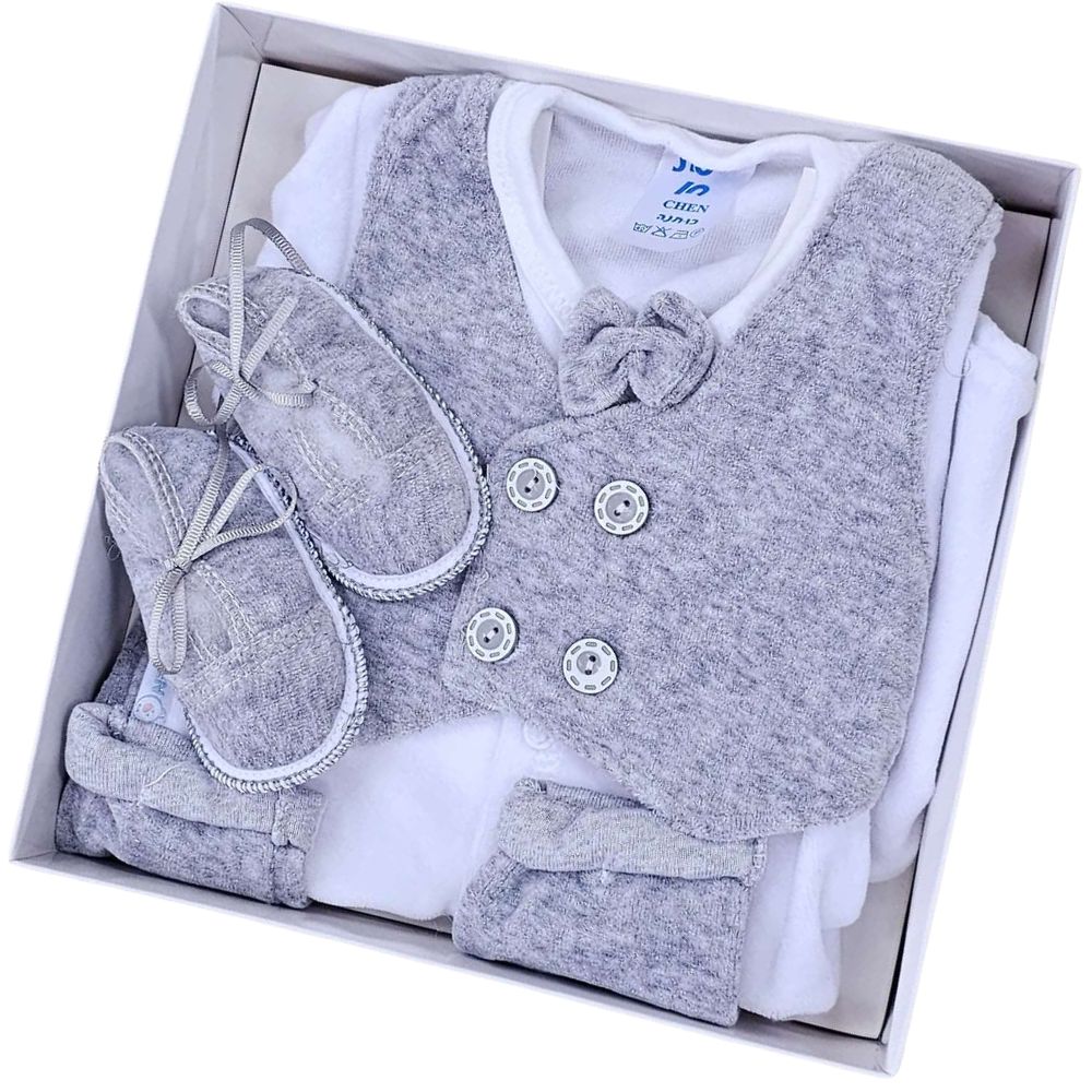 סט מהודר מקטיפה: חולצה, מכנס, ווסט, פפיון, כובע ונעלים - אפור סריגת חן