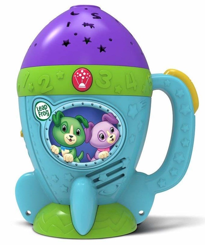 מנורת לילה עם מקרן כוכבים מבית LEAPFROG סופרת לאחור עד שנרדמים בזמן שהיא מקרינה כוכבים עדינים על גבי קירות החדר. לחיצה על הכפתור תהפוך אותה למקרן כוכבים עם סקוט האסטרונאוט שמלמד את שמות הכוכבים וצבעם. טיימר לכיבוי עצמי