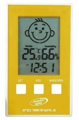 מכשיר ייחודי מסוגו בארץ! מד טמפרטורה ולחות אינטראקטיבי לחדרי התינוקות והילדים. מודד טמפרטורה ולחות בחדר ומבטיח סביבה נעימה ובריאה בחדרי הילדים.