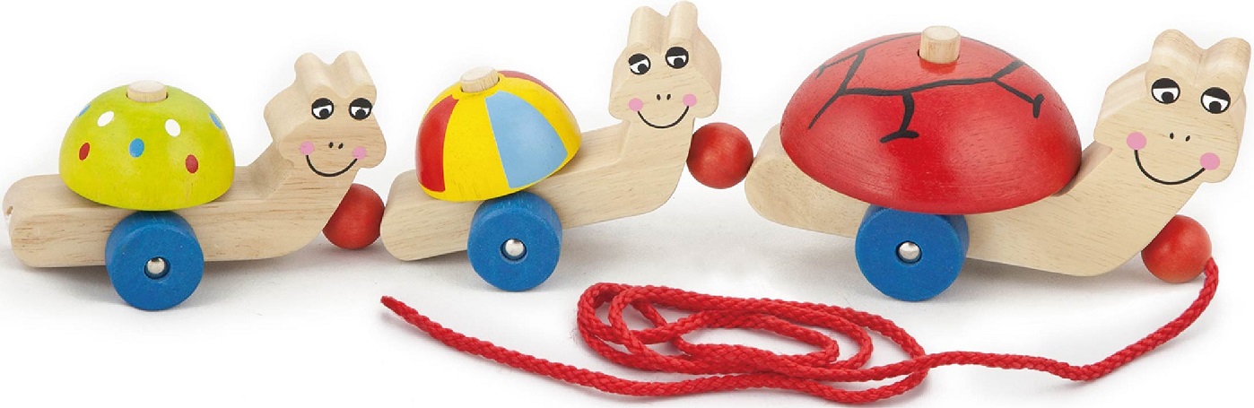 הצעצוע כולל שלושה צבים למשיכה בעזרת חוט לעידוד זחילה