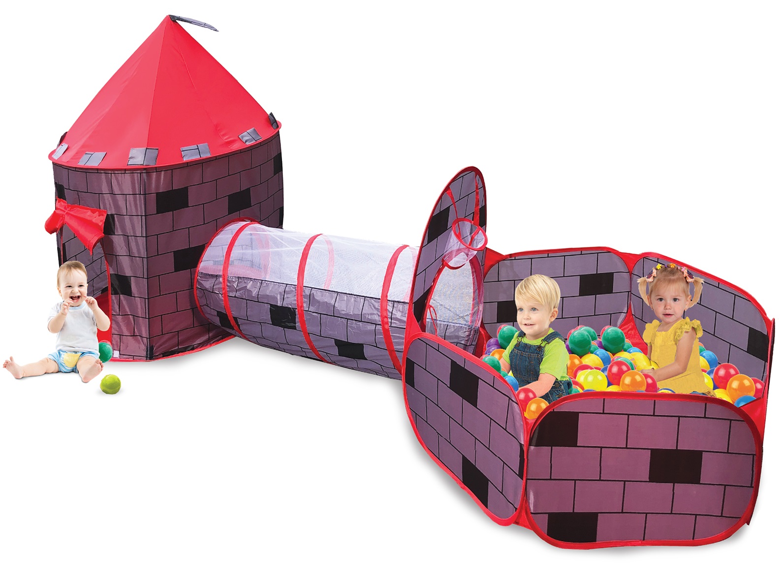 סט המשחקים המושלם - אוהל טירה עם בריכת כדורים ומנהרת זחילה + 50 כדורים - אדום + 100 כדורים צבעוניים בגודל 6 ס"מ לאוהל/בריכה =
