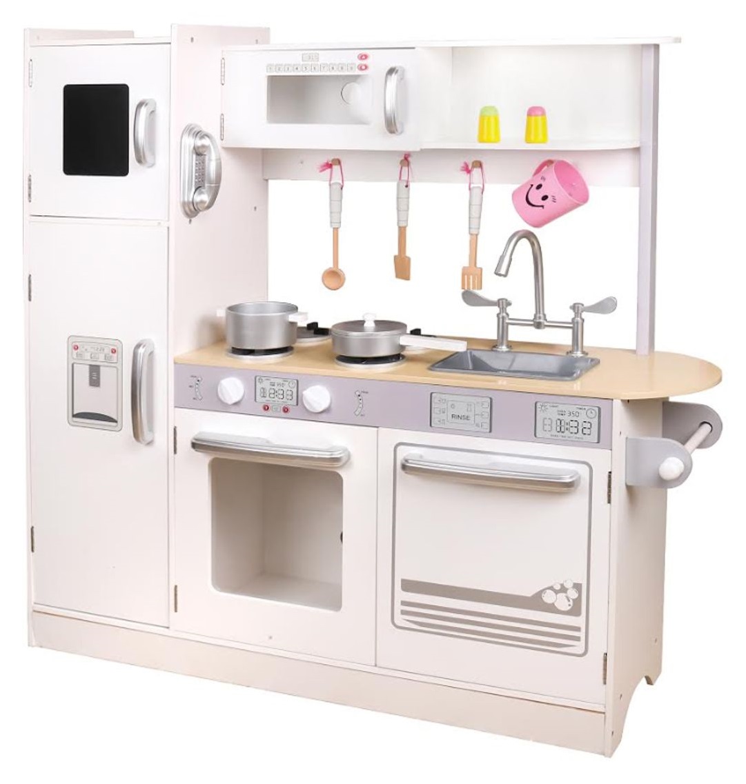 מטבח העץ מדמה מטבח אמיתי עם כל הציוד הנדרש במטבח: כיריים, מיקרוגל, תנור אפייה נפתח, כיור עם ברז כסוף, מקרר עם מכשיר קרח בחזית, מקפיא עליון ואפילו טלפון לחצנים כסוף