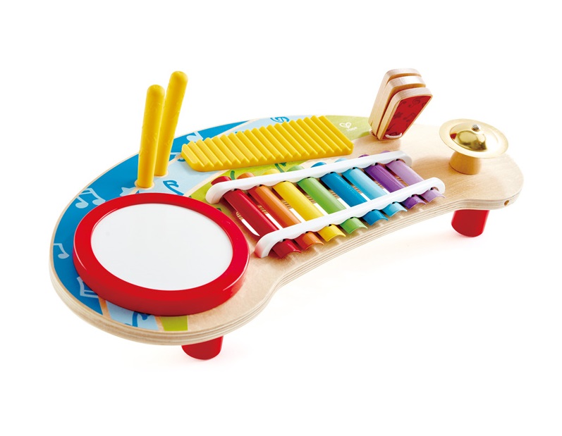 מרכז נגינה מבית HAPE זוכה פרס PAL AWARD כולל מגוון כלי נגינה: קסילופון, תוף, מצילה ועוד לפיתוח שמיעה מוזיקלית ויכולות מוטוריות אצל פעוטות.