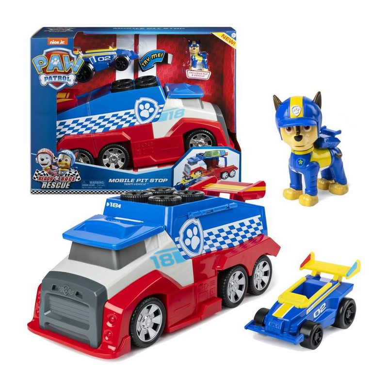 משאית מוסך טיפולים של מפרץ ההרפתקאות עם תא נהג עילי, דלת אחורית נפתחת, רמפה צדדית נשלפת לשיגור רכב בזמן נסיעה, כולל מכונית ספורט ודמות צ’ייס