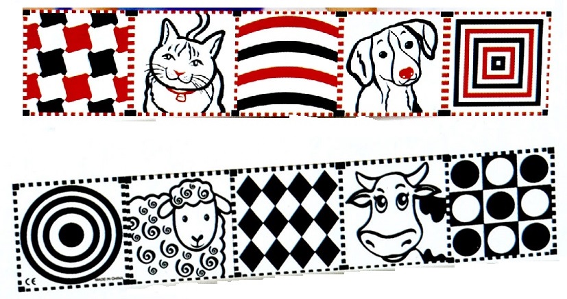 שלב ב’ – צד שחור\לבן\אדום: תחילת ההיכרות עם צבעים, איורי חיות וצורות שמחים המעודדים ומעשירים גירויים חזותיים