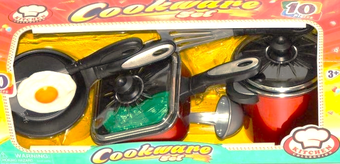 מארז כלי בישול לילדים הכולל סיר מרק ומכסה, מחבת גריל עם מכסה, מחבת קלסית, תרווד, מצקת, מרית, בית עין וברוקולי