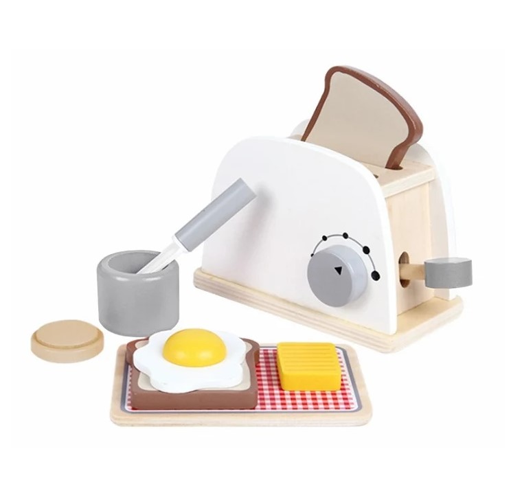 ערכה להכנת טוסט הכוללת מצנם, מגש, שתי פרוסות, לחם, חמאה, ביצת עין וכלי מלח בית העץ