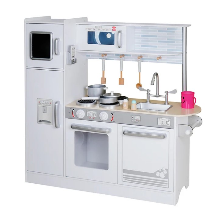 מטבח ילדים עם מקרר מקפיא עליון, כיור ושני ברזים, כיריים 4 להבות עם כפתורים מסתובבים, מיקרוגל, תנור ומדיח כלים