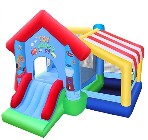 בית צעצוע מתנפח וצבעוני עם שטח קפיצה אמצעי מוקף ברשת הגנה היקפית ומגלשה כולל מפוח, תיק אחסון וערכת תיקונים