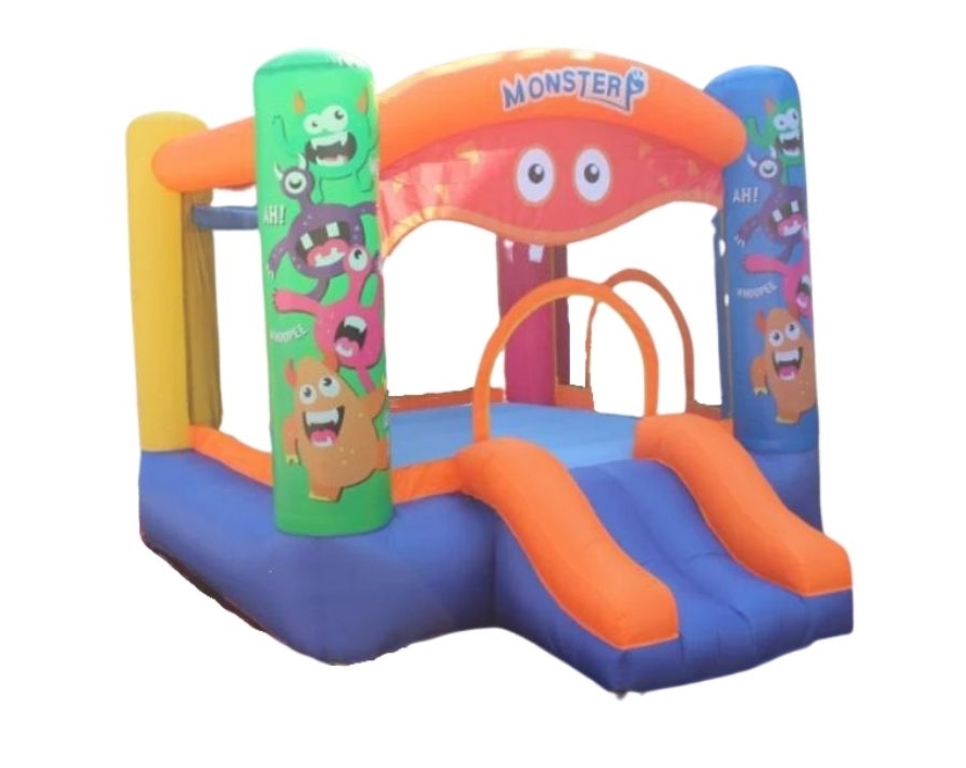מתנפח לחצר הבית עם ארבעה עמודים, סל, רשת היקפית ומגלשה, כולל מפוח ותיק אחסון - מפלצות שמחות קפיץ קפוץ