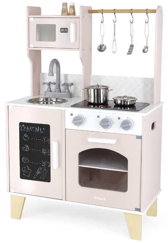 מטבח השף הקטן לילדים עשוי עץ מלא, אורות ואפקטים קוליים, תנור, כיור, כיריים ו 10 אביזרים - ורוד פסטל PolarB