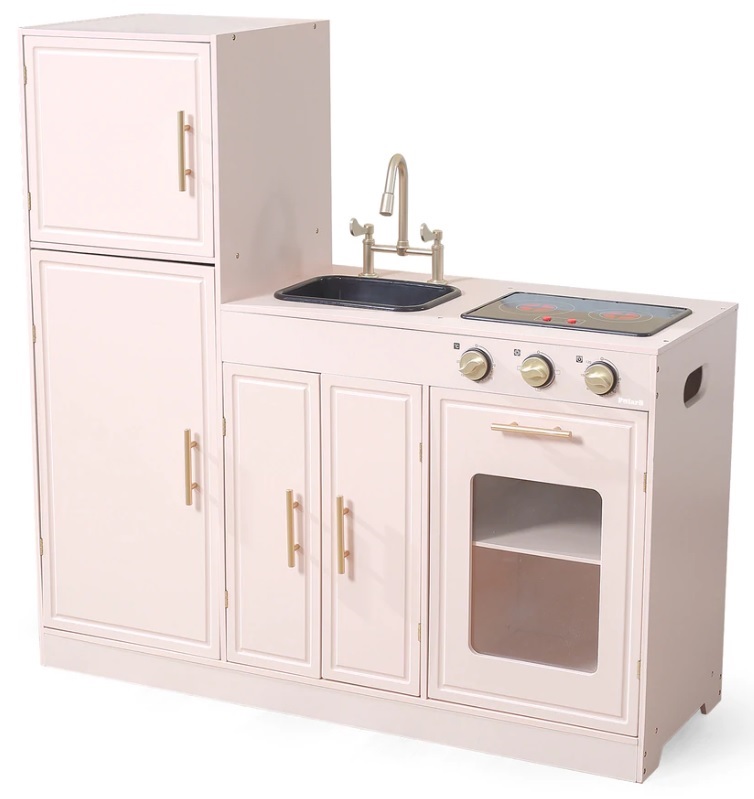 מטבח קלאסי מודרני לילדים מעץ עם כיור, תנור, מקרר וכיריים עם אורות ואפקטים קוליים - ורוד פסטל PolarB