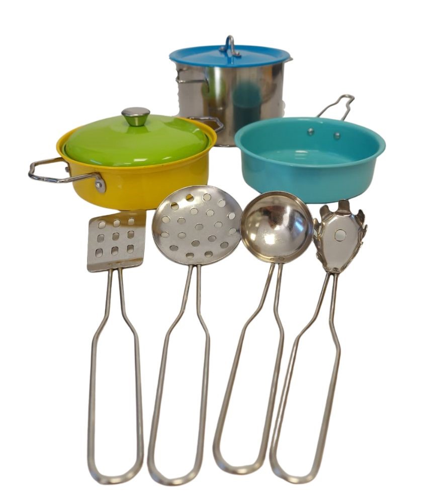 ערכת משחק לילדים עם סירים וכלי בישול עשויים נירוסטה צבעונית.