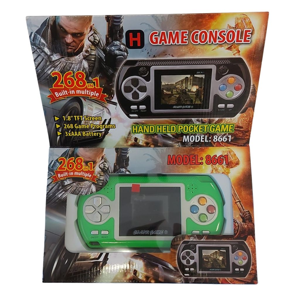 קונסולת משחקים עם 268 משחקים מובנים בעיצוב רטרו במגוון צבעים לבחירה.