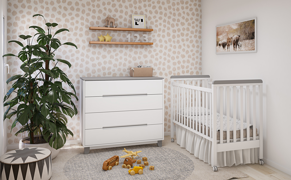 חדר תינוק יובל במראה נקי בלבן משולב אפור אפנתי + מזרן למיטת תינוק או מעבר במידה של 127 על 66 ס"מ עם בד מנדף זיעה