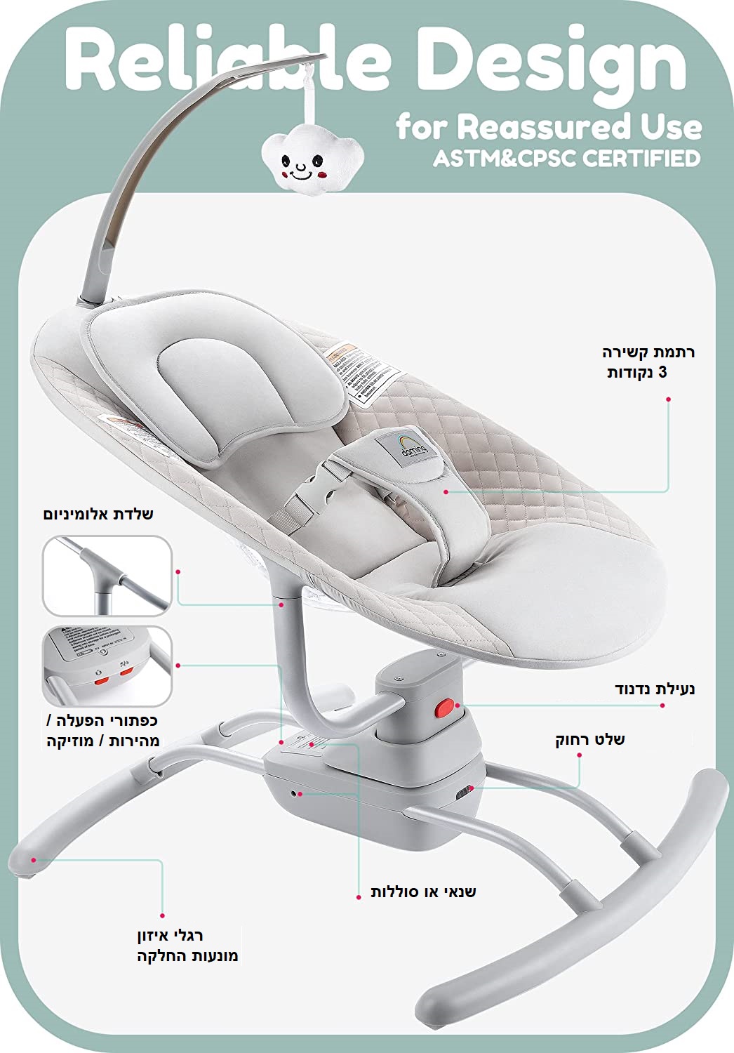 עיצוב אמין ובטיחותי – עומד בתקינת האגודה האמריקנית לבדיקות וחומרים ומכות התקנים הישראלי – הנדנדה מעוצבת במיומנות עם רגלי איזון נגד החלקה, מסגרת מסגסוגת אלומיניום ורתמה קשירה בעלת 3 נקודות על מנת להעניק את רמת הבטיחות הגבוהה ביותר לתינוק שלך.