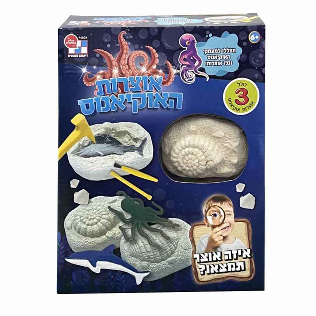 מה בפנים: 3 יחידות של אוצרות ממעמקי הים, פטיש, איזמל, זכוכית מגדלת, שקית בד, הוראות