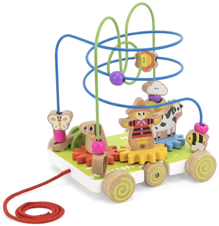מבוך חרוזים מתגלגל עם 2 מסלולים מעץ מלא עם גלגלי שיניים וחוט משיכה - חווה ויגה
