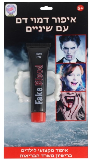 נוזל דמוי דם וסט שיני ערפד מפלסטיק