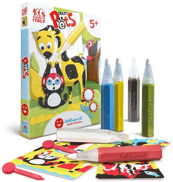 ערכת יצירה לילדים: 7 ציורי חיות מחמד שובבות ו 6 עטי חול צבעוניים Sabbiarelli