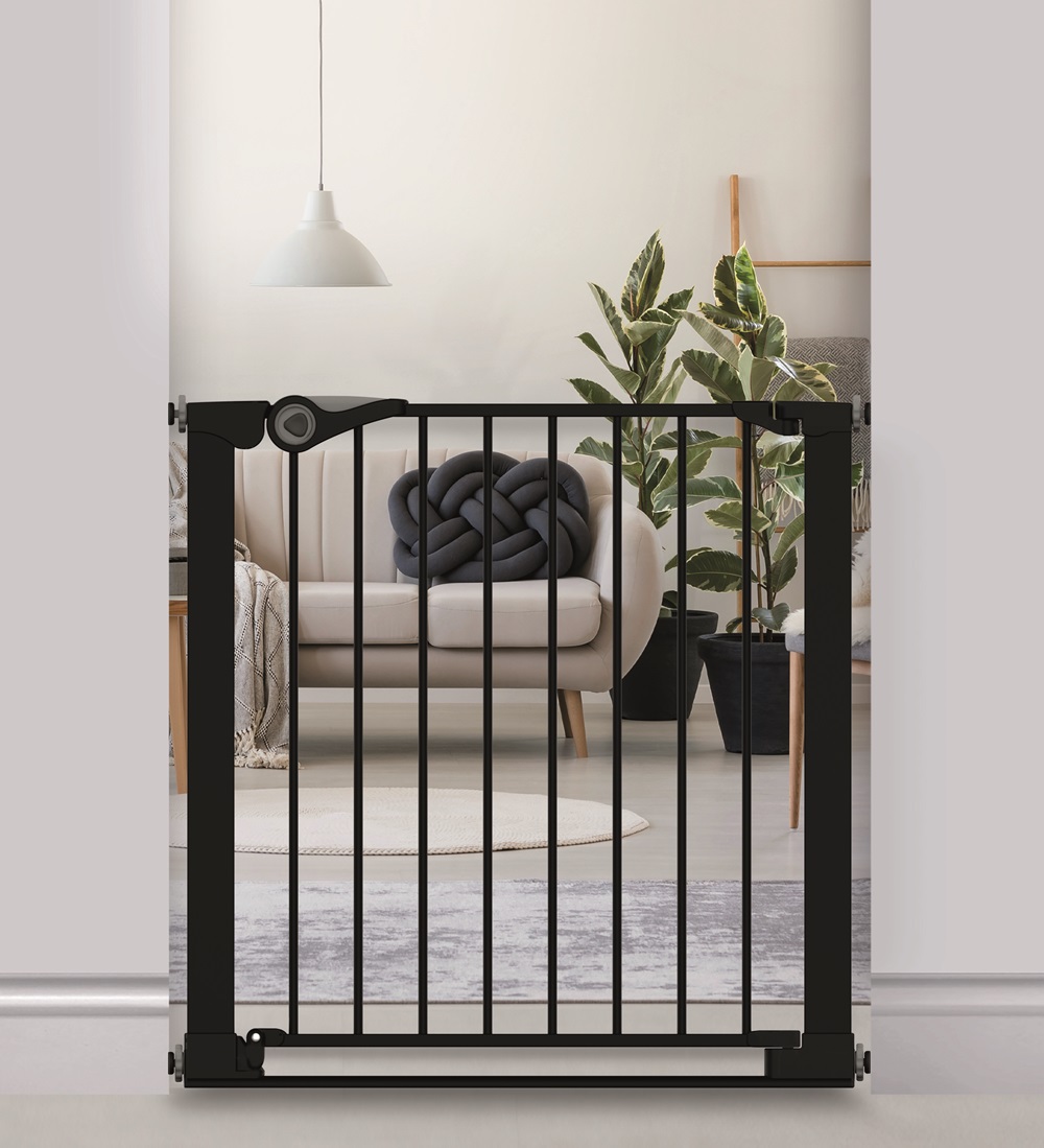 שער בטיחות 'ללא קדיחה' עם פס תחתי צר למניעת נפילות ומנגנון נעילה כפול לפתחים רחבים בגודל 75 עד 96 ס"מ - שחור + זוג מתאמי Y בין שער בטיחות למעקה עם ציפוי גומי מונע החלק ושריטות =