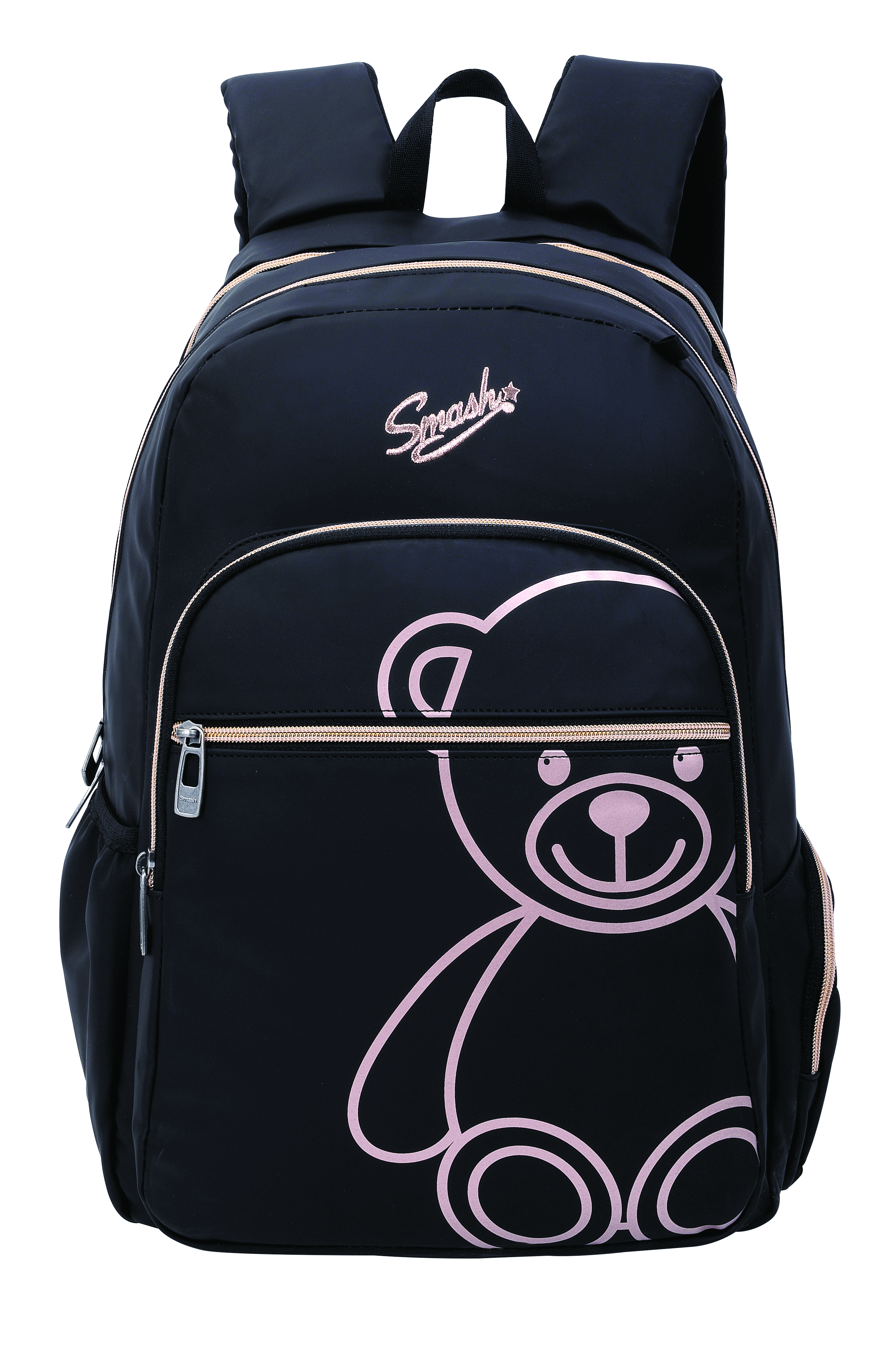 תיק גב אפנתי לנוער עם גב קשיח אורטופדי, ארבע תאי חלוקה, שני תאי צד ותא נגד גניבות - שחור ודובי רוז גולד סמאש