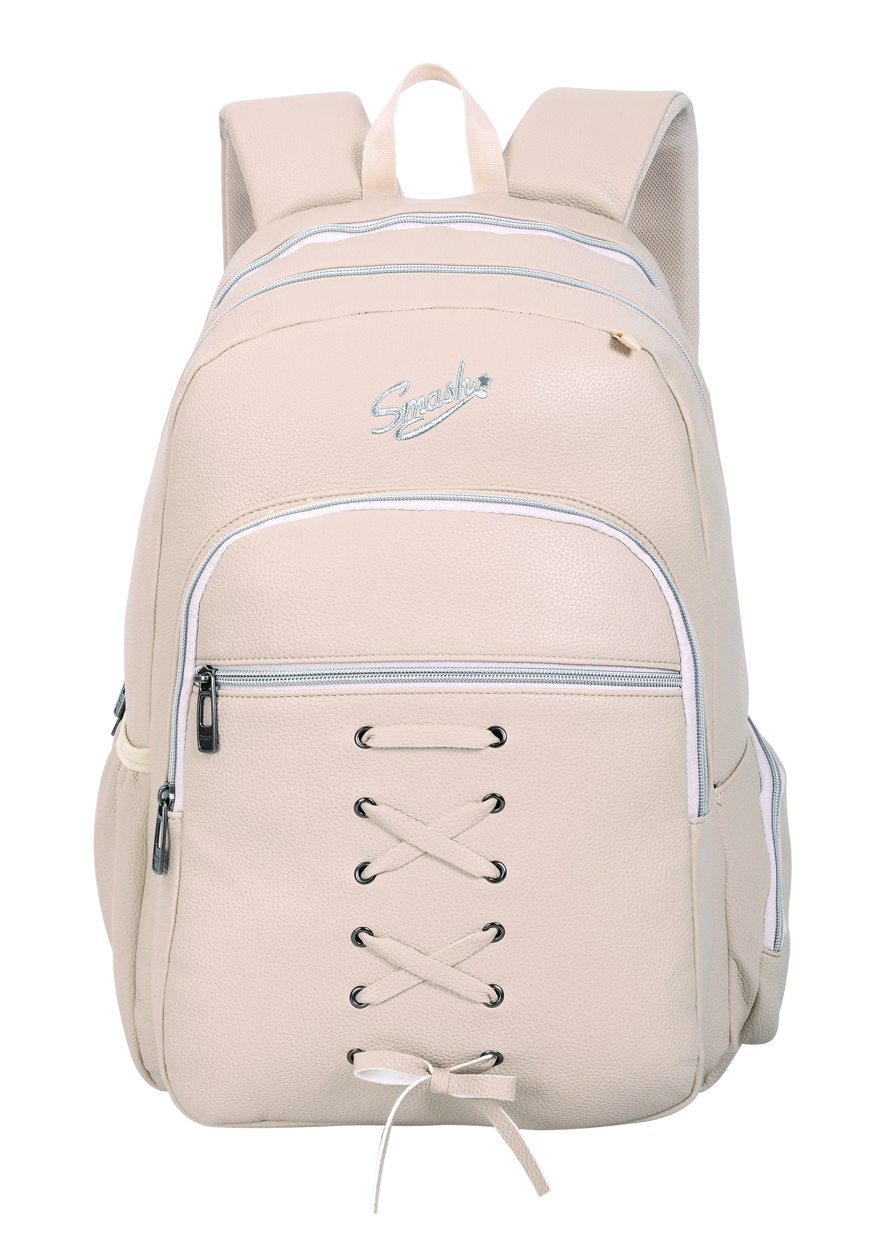 תיק גב אפנתי לנוער עם גב קשיח אורטופדי, ארבע תאי חלוקה, שני תאי צד ותא נגד גניבות - שמנת דמוי עור שרוכים סמאש