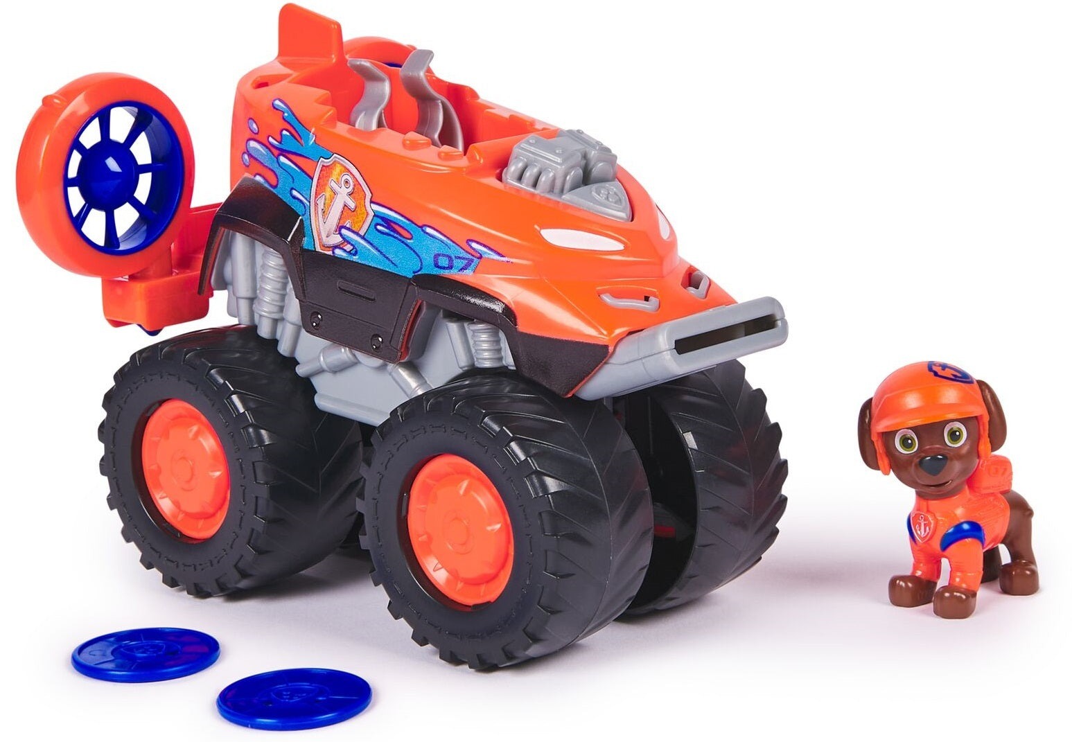 הרחפת של זומה יורה דיסקיות עם גלגלי ענק ודמות מפרץ ההרפתקאות