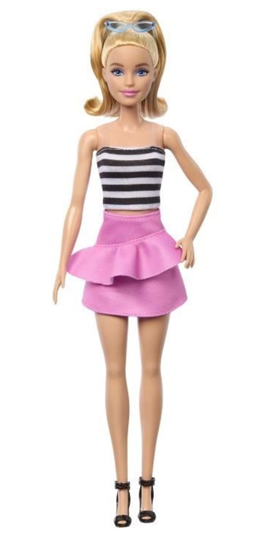 בובת ברבי בחליפת פסים שחור/לבן וחצאית ורודה