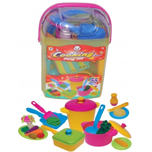 בתוך הדלי מגוון של 55 אביזרים וכלי אוכל למשחקי מטבח לילדים: כלי בישול, דמויי מצרכי מזון, כלי הגשה ועוד