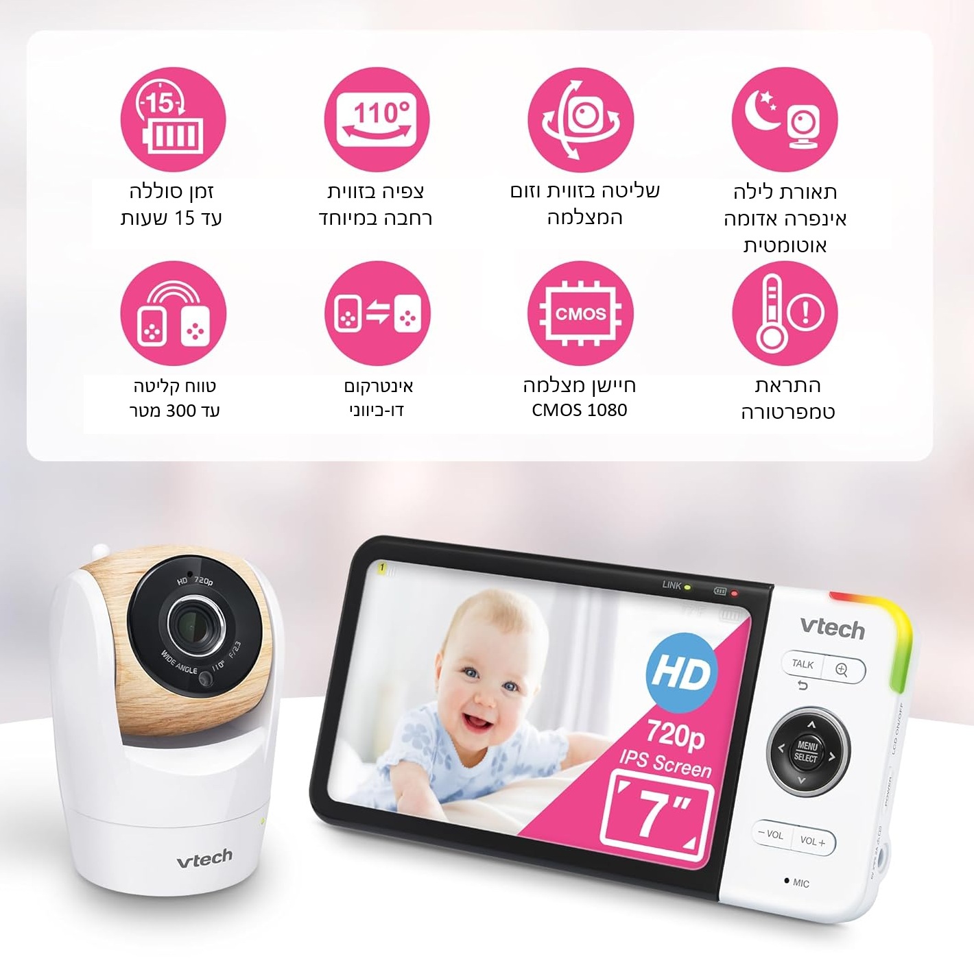 אינטרקום דיגיטאלי דו-כיווני לתינוק VM919 עם מסך "7 HD ענק, מצלמה מסתובבת וחישן טמפרטורה ויטק