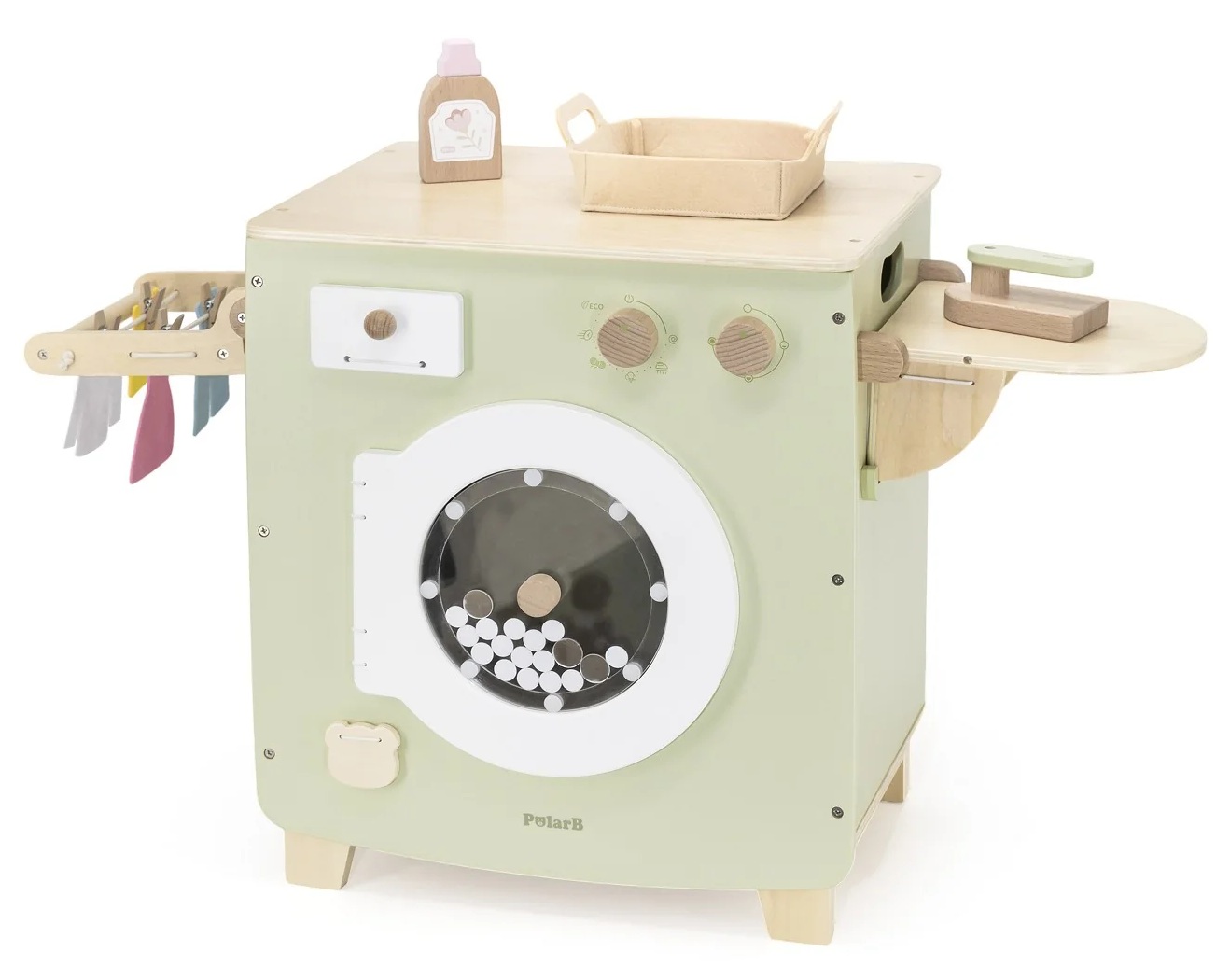 מכונת כביסה מעץ עם תוף ניתן לסיבוב ואביזרי משחק PolarB