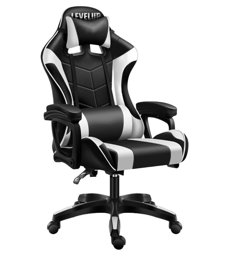 כסא גיימרים ארגונומי איכותי LEVEL UP עם 2 כריות תמיכה, שינוי זוויות של 90-170 מעלות - שחור/לבן קפיץ קפוץ