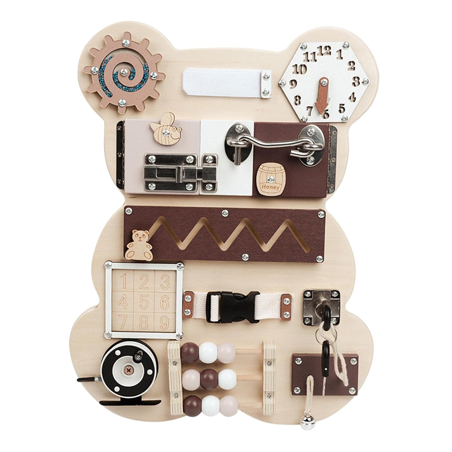 הלוח עוצב בצורת דוב חמודה ולוח פעילות משעשע לפתיחת מנעולים עם פעילויות שונות.