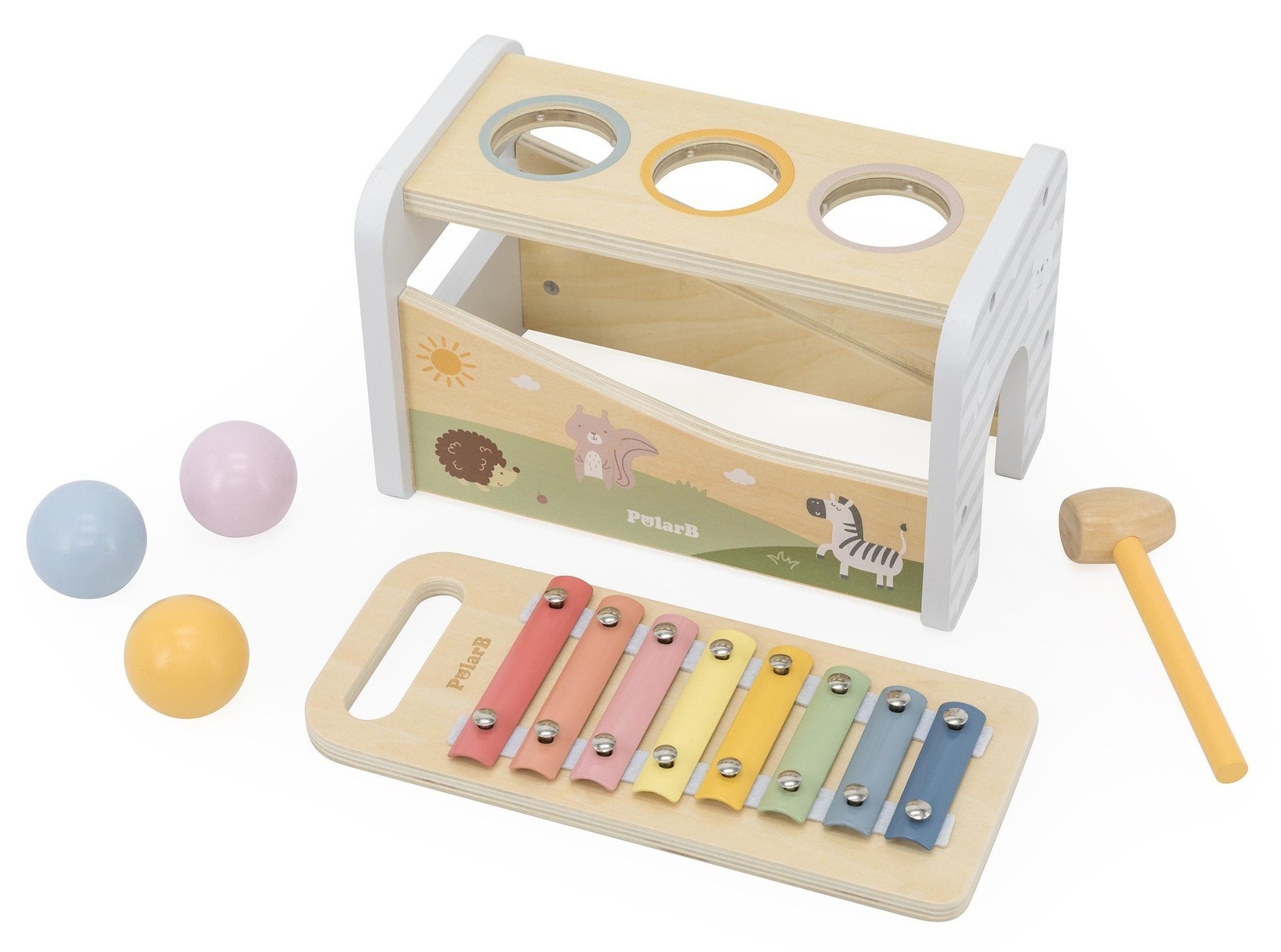צעצוע עץ דו-צדדי 2 ב-1: פטיש כדורים וקסילופון PolarB