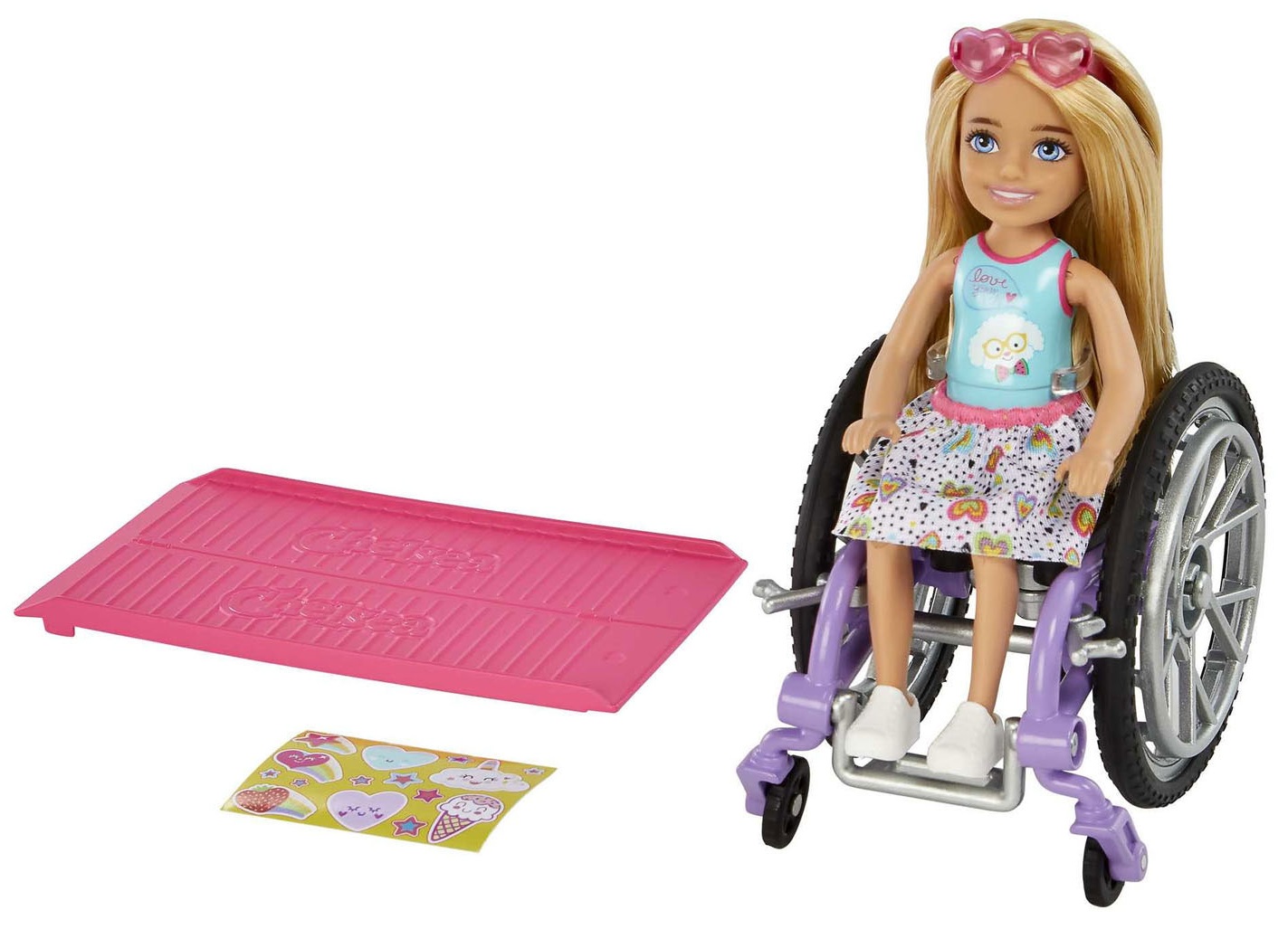 בובת ברבי צ'לסי בכיסא גלגלים כולל רמפה ומדבקות - בלונדינית