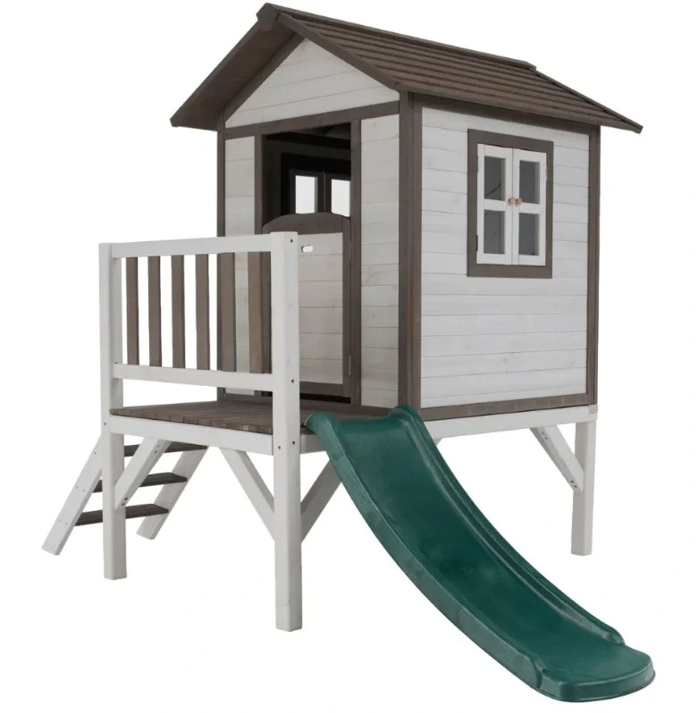 בית עץ כפרי לילדים עם מרפסת, מדרגות, מגלשה, חלון ודלת בית העץ