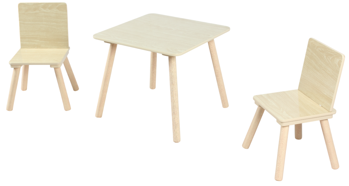 סט שולחן ושני כסאות עשויים מעץ מלא וישדרג כל חדר ילדים.