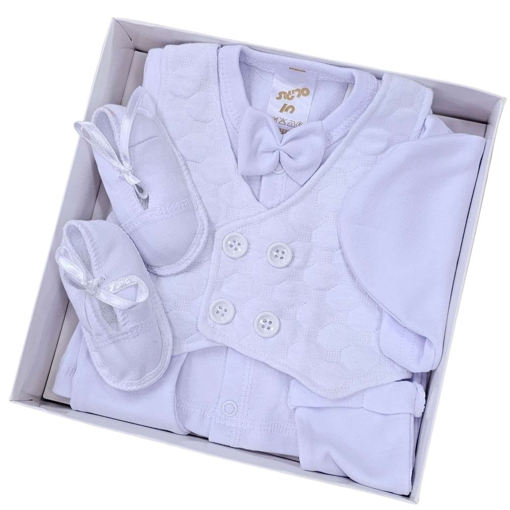סט מהודר לברית מילה: חולצה, מכנס, ווסט, פפיון, כובע ונעלים - לבן סריגת חן