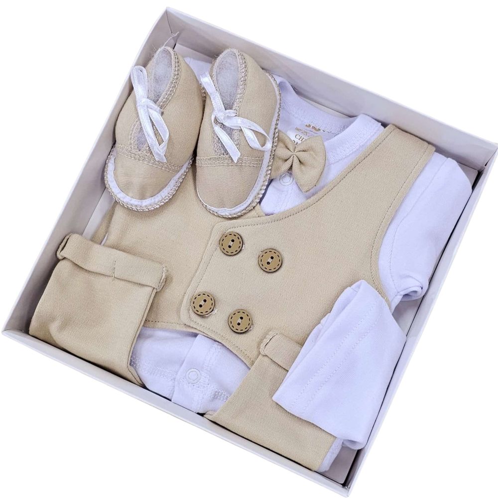 סט מהודר לברית מילה: חולצה, מכנס, ווסט, פפיון, כובע ונעלים - בז' סריגת חן