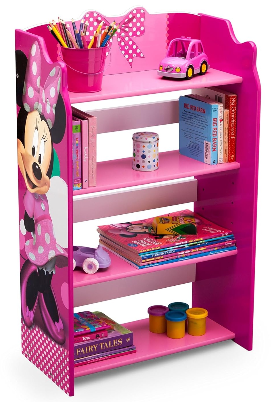 עיצוב מיני מאוס אהוב: המדף מעוצב בצבע ורוד עז (פוקסיה) וכולל דמות גדולה ומחייכת של מיני מאוס (Minnie Mouse) בצד, וכן קישוט פפיון מנוקד בחלק העליון.
