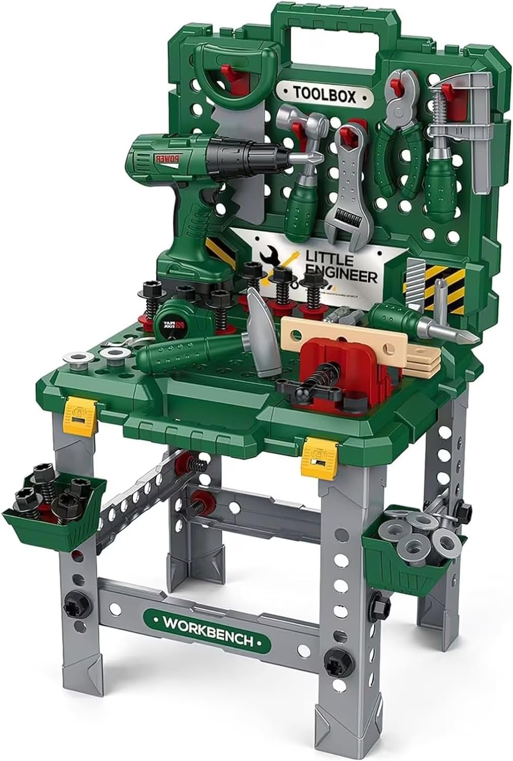 השולחן כולל מגוון רחב של כלים אינטראקטיביים המדמים עבודה אמיתית. הערכה מצוידת במקדחה חשמלית הפועלת על סוללות, פטיש, צבת, מפתח שוודי, מסור, מברגים וסט עשיר של ברגים ואומים. מבנה השולחן כולל לוח תלייה לכלים, מדפים צדדיים לאחסון חלקים קטנים ומלחציים מובנים על משטח העבודה הראשי.